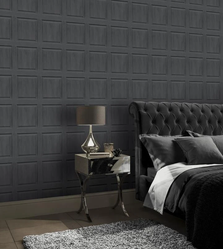 Boast a sense of opulence in your home with decorative panelling wallpaper for a classy and classic look. The faux panelling wallpaper has the added touch of visible wood grain which adds to the finished effect and the charcoal colour is very on trend.