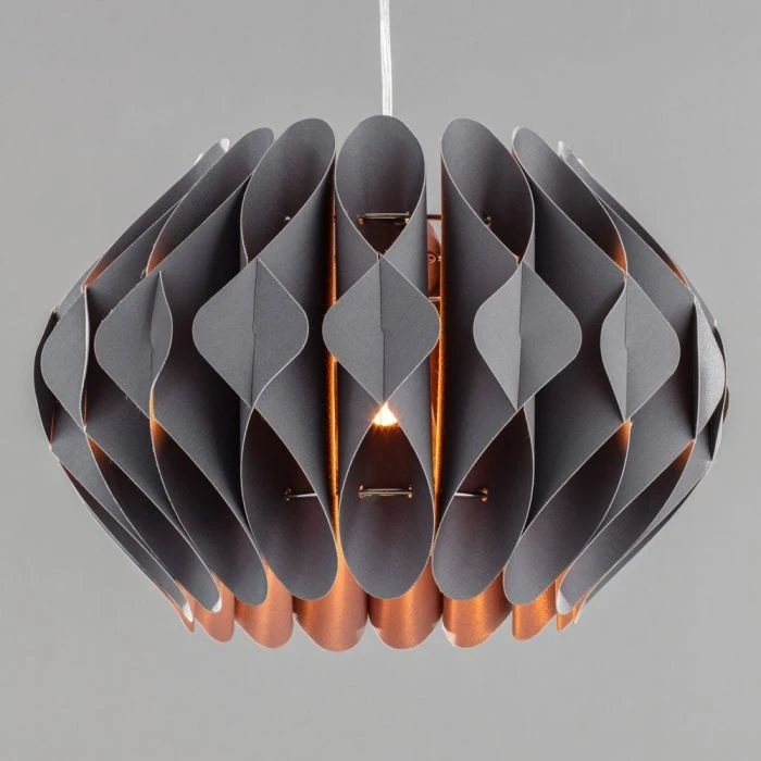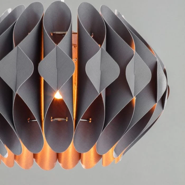 ‘This beautifully designed Landon small Easyfit Shade can be attached to any pre-existing fitting. Finished in a dark grey, its geometric pattern of fabric rolls, let out a warm glow providing a calming atmosphere, which is perfect for a living room or bedroom.