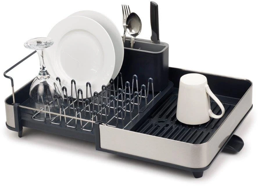 This smart dish rack features a 2-part sliding tray that allows you to easily adjust the size of your draining space when you need more room.