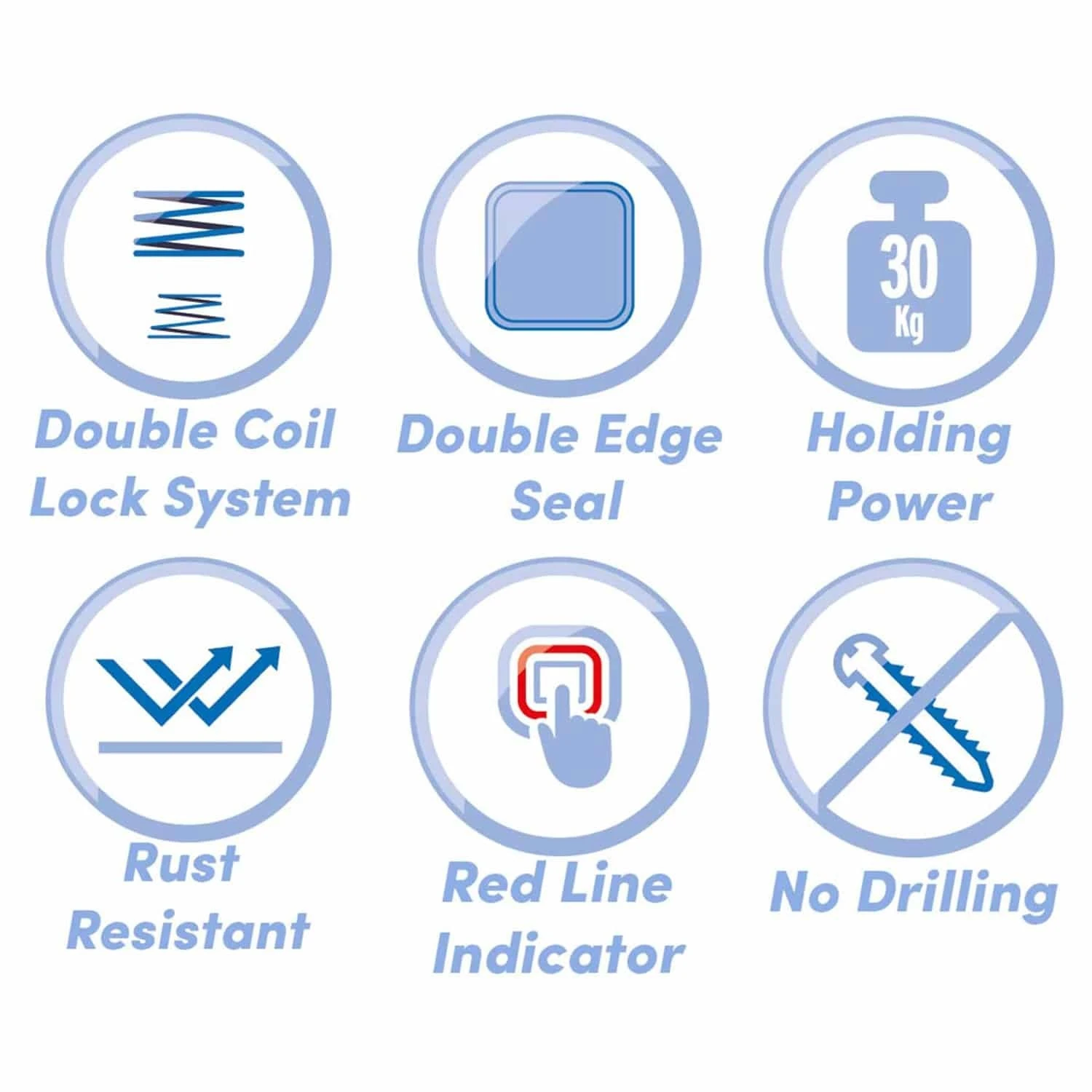 Each suction pad has a double edge ring which increases the holding power and staying time of the accessory, making it stronger than most other suction products on the market. The suction pads have a tight grip on smooth surfaces like glass or tiles. Pushloc Suction System forms a strong vacuum between the suction pad and the wall. If the red ring reappears after a short time then the surface you are trying to apply it to may be porous or textured and cannot allow a vacuum to form.To rectify this purchase a Showerdrape Self Adhesive Square. Simply place the self adhesive square to the desired position and then Pushloc accessory onto the square for the perfect result.