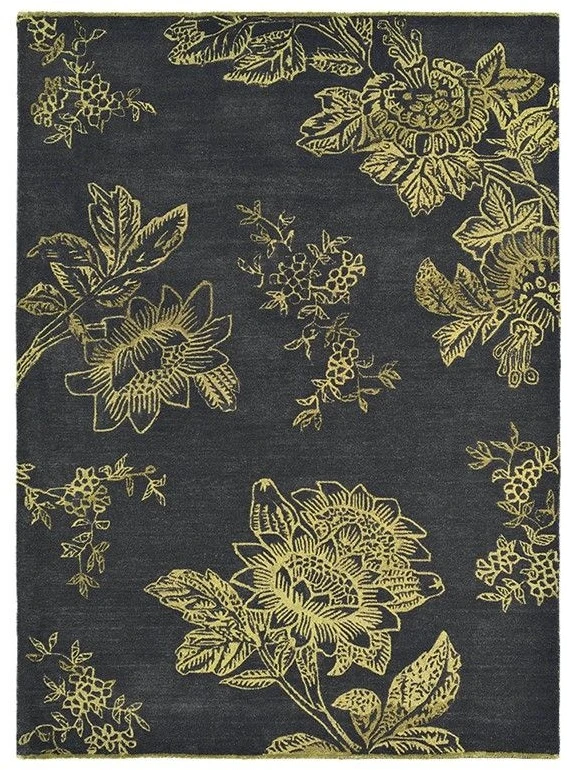 Tonquin Rugs 37005 by Wedgwood features an intricate leafy and elegant rose-like bloom in golden tones against a plain charcoal grey background which exudes classical elegance.